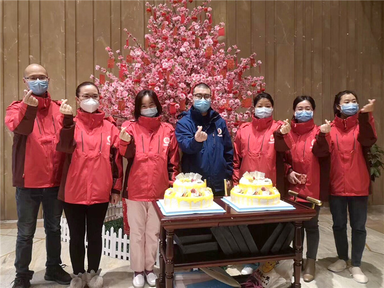 今天還是特別的一天,晚上7:00,我們就住的武漢東西湖華美達(dá)酒店精心準(zhǔn)備,為2月過生日的安徽醫(yī)療隊隊員集體慶生。桌上是兩個精美的生日蛋糕,旁邊的粉紅色桃花樹上則掛滿了隊友們的暖心祝福。酒店經(jīng)理代表酒店和武漢人民,祝福小玲、燕子還有其他隊友生日快樂,更為他們送上精心準(zhǔn)備的生日禮物。這個大集體團(tuán)結(jié)又溫暖,大家共同唱起了生日快樂歌,在歡笑中一起分享蛋糕,傳遞快樂。