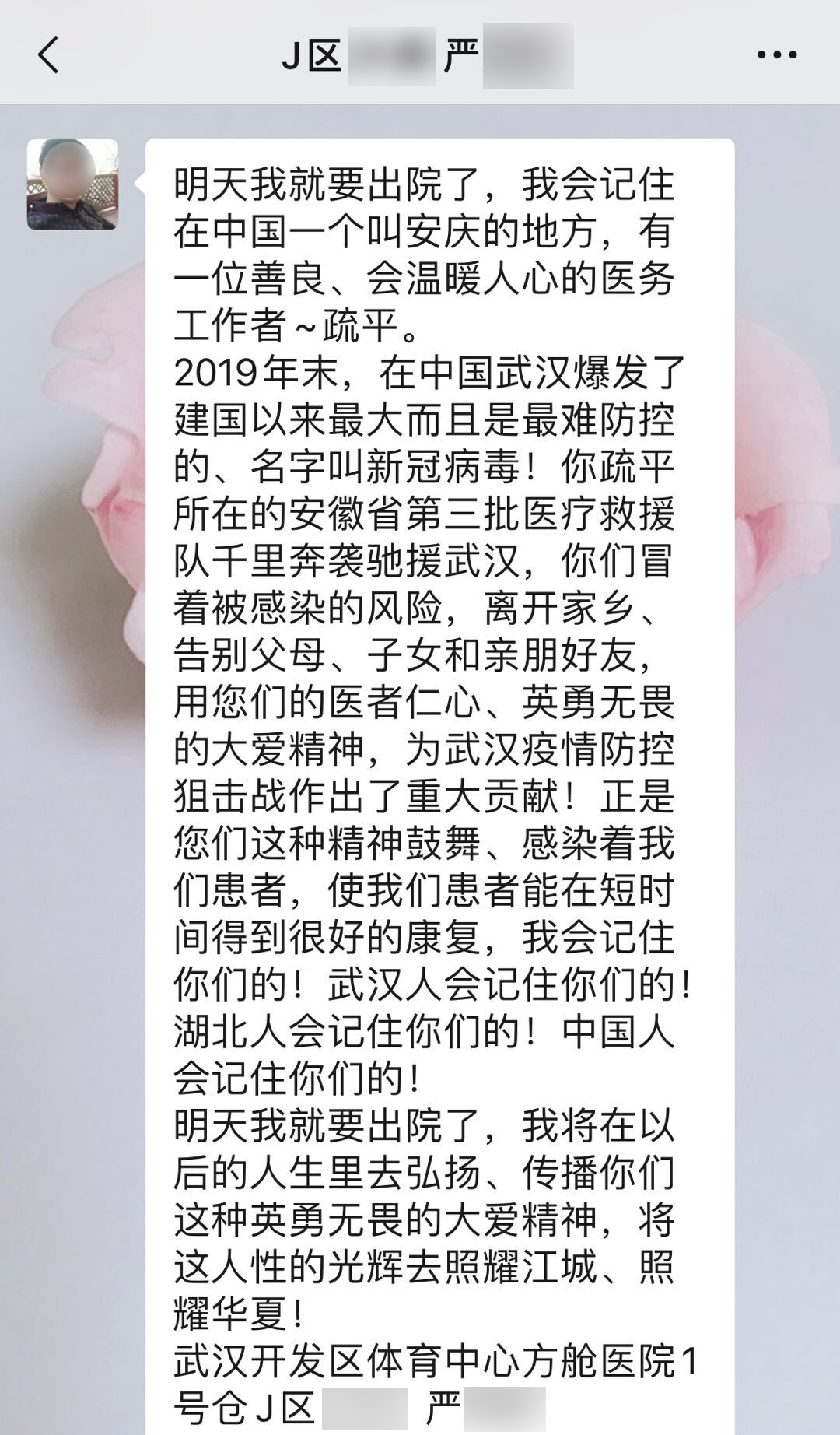 經(jīng)過(guò)兩次RT—PCR檢測(cè)陰性和一次胸部CT檢查提示肺部炎癥明顯吸收后,疏平發(fā)信息告知嚴(yán)先生,經(jīng)過(guò)醫(yī)生的討論,他已經(jīng)達(dá)到出院標(biāo)準(zhǔn),3月7日就可以出院。嚴(yán)先生得知這個(gè)消息后非常高興,“感謝安徽醫(yī)療隊(duì),感謝石化醫(yī)院的醫(yī)護(hù),是你們的精心治療和護(hù)理,幫助我們轉(zhuǎn)危為安,方艙大家庭真的很溫暖?!?/span>
