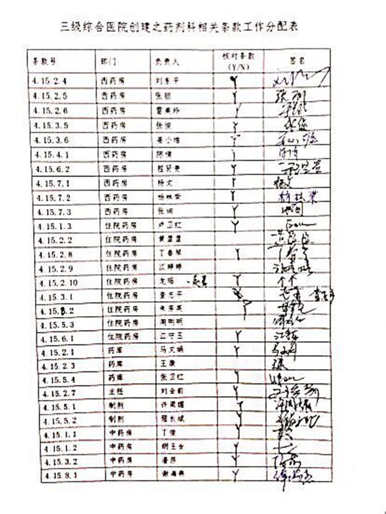劉會(huì)前主任首先傳達(dá)了醫(yī)院創(chuàng)建的有關(guān)目標(biāo)和相關(guān)文件精神,振奮了人心,鼓舞了士氣。藥劑科創(chuàng)建條款,人手一條,從在創(chuàng)建條款工作分配表上簽上自己名字的那一刻開(kāi)始,就要全程負(fù)責(zé)到底。