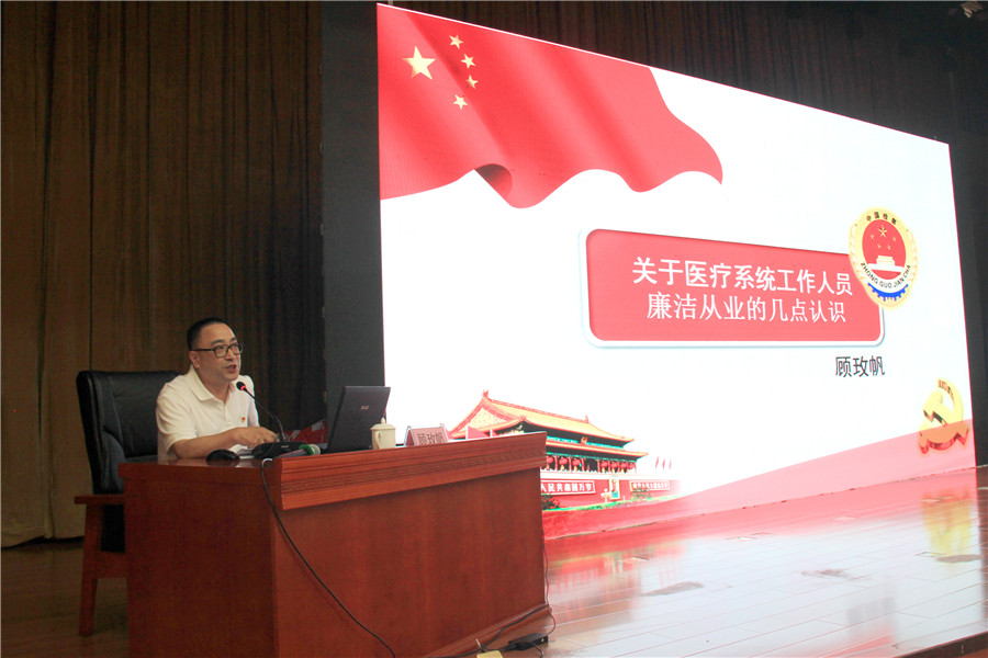 活動(dòng)特邀安慶市檢察院黨組書記、檢察長(zhǎng)顧玫帆,分享了自己對(duì)于醫(yī)療系統(tǒng)工作人員廉潔從業(yè)的思考與認(rèn)識(shí)。顧檢察長(zhǎng)結(jié)合反腐敗斗爭(zhēng)的新形勢(shì)、新要求,以及自己查辦的貪污腐敗案例,從執(zhí)法辦案和懲治犯罪的專業(yè)視角,對(duì)如何有效預(yù)防和打擊醫(yī)療行業(yè)犯罪進(jìn)行詳細(xì)分析。以案說(shuō)廉、由表及里的授課形式引人深思,激勵(lì)各位黨員干部以案為鑒,做到自省自律自警,不斷增強(qiáng)敬畏法紀(jì)的意識(shí)和拒腐防變的定力。