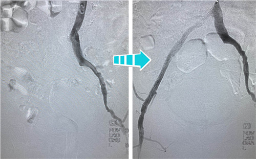 右側(cè)完全閉塞的髂血管順行開通無果,但這也難不倒我們經(jīng)驗(yàn)豐富的鼓醫(yī)和石醫(yī)介入專家們,當(dāng)即決定由“順穿”改行“逆穿”。逆穿導(dǎo)絲難度大,技術(shù)要求高,十分考驗(yàn)術(shù)者的操作手法和預(yù)判,專家團(tuán)隊(duì)經(jīng)過內(nèi)膜下破膜逆行,一次性準(zhǔn)確對(duì)吻成功,同樣擴(kuò)張球囊、植入支架,血流瞬間恢復(fù)暢通。