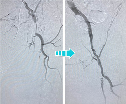 84歲的患者吳老原本只是走路時(shí)感覺小腿痛,慢慢地,他發(fā)現(xiàn)睡覺躺下時(shí)也疼得厲害,且有愈演愈烈的趨勢(shì)。入院完善相關(guān)檢查,這才找到腿疼的根源——竟然是血管堵住了!雙下肢血管造影顯示,吳老先生的情況不容樂觀,右側(cè)髂血管完全閉塞,左側(cè)髂血管重度狹窄,左側(cè)股淺開口以下同樣閉塞。如不及時(shí)治療,病情繼續(xù)惡化,皮膚會(huì)慢慢潰爛、發(fā)黑直至壞疽截肢。