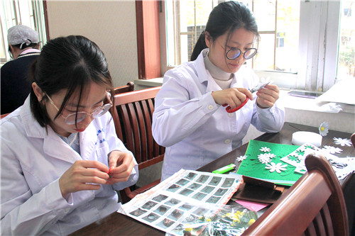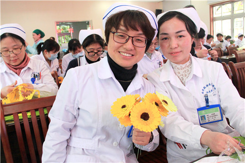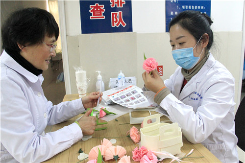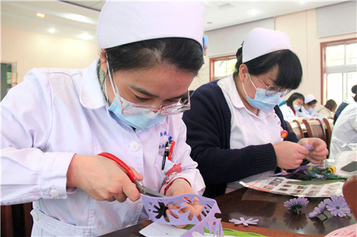 醫(yī)院近150名女職工歡聚在一起,放松心情,默契合作。愜意談笑間,創(chuàng)造出一片五彩繽紛的花海!拈花淺笑著,快樂的心花兒亦朵朵綻放!