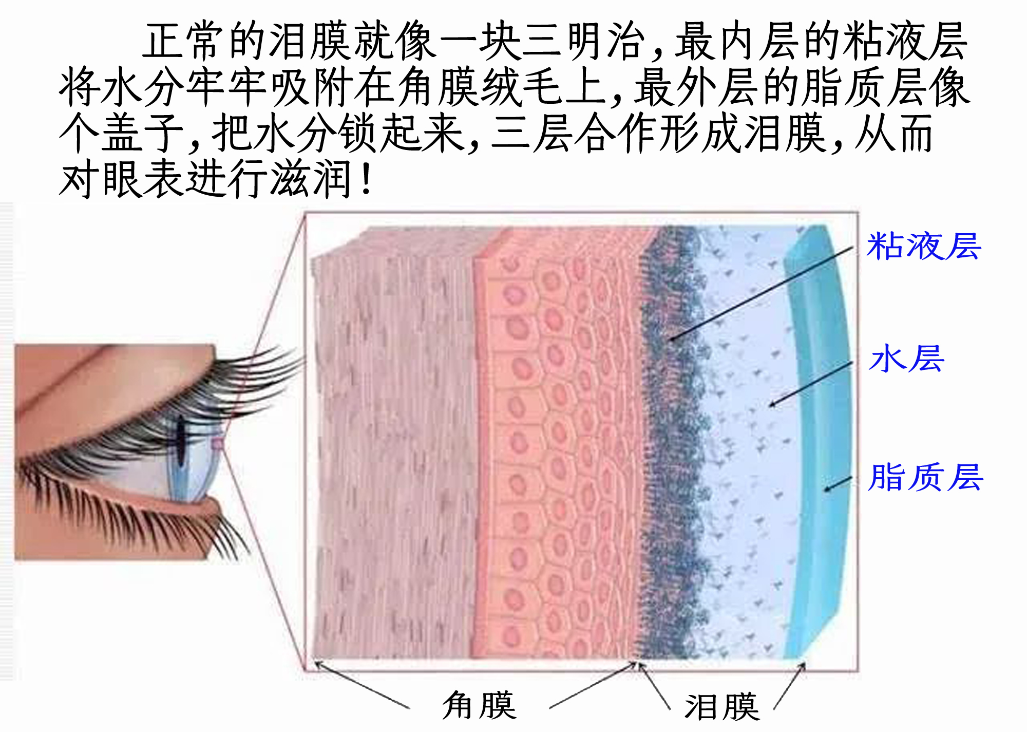淚膜并不是一直存在于眼表的,一定時間后,淚膜會破散,需要通過眨眼的動作形成新的淚膜,持續(xù)對眼睛起到潤滑、保護的作用!