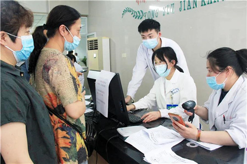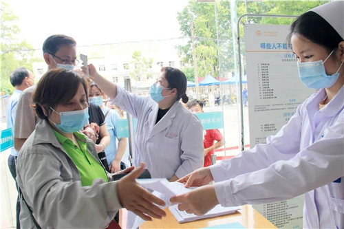 醫(yī)務人員為市民依次測量體溫,發(fā)放知情同意書并指導他們填寫相關信息。