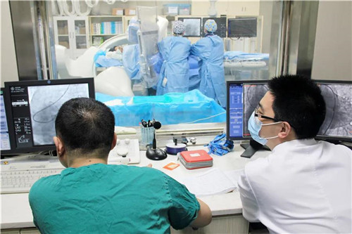 石化醫(yī)院暢通綠色急救通道,40分鐘后,救護車直接將胡女士送到了導管室,心血管內科急診介入救治小組早已就位。