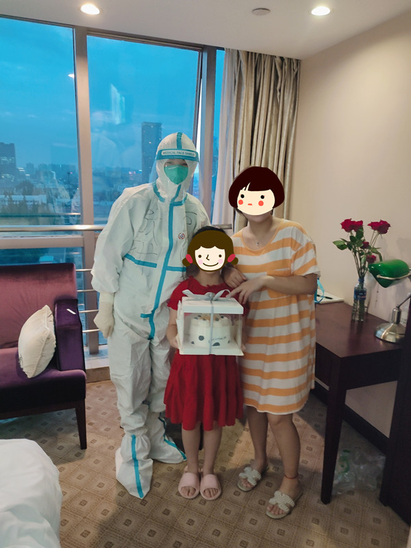這天,我們工作總臺接到一個電話。趙先生的愛人劉女士和女兒在我們這里隔離,恰逢夫妻倆的結(jié)婚五周年紀念日,趙先生想給愛人一個驚喜卻無法見面。了解到情況后,我們主動提出幫助趙先生完成他的心愿,化身“大白快遞員”,將禮物和鮮花送給了他的愛人。收到驚喜的劉女士,露出了隔離以來最燦爛的笑容。所愛隔山海,山海皆可平,有愛的一家人,真好!