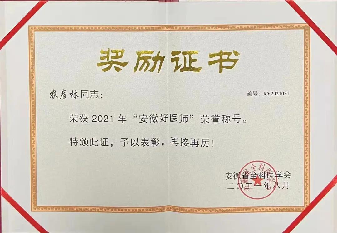 本次評(píng)選由各地全科醫(yī)學(xué)會(huì)分會(huì)、專業(yè)委員會(huì)研究確定推薦對(duì)象,再由安徽省醫(yī)學(xué)會(huì)辦公室和監(jiān)事會(huì)對(duì)推薦情況進(jìn)行審核和評(píng)審,最后優(yōu)中選優(yōu),綜合評(píng)選出“2021年安徽好醫(yī)師、好藥師”。石化醫(yī)院心血管內(nèi)科主任助理、副主任醫(yī)師農(nóng)彥林榜上有名,榮獲“2021年安徽好醫(yī)師”榮譽(yù)稱號(hào),現(xiàn)場(chǎng)接受頒獎(jiǎng)。