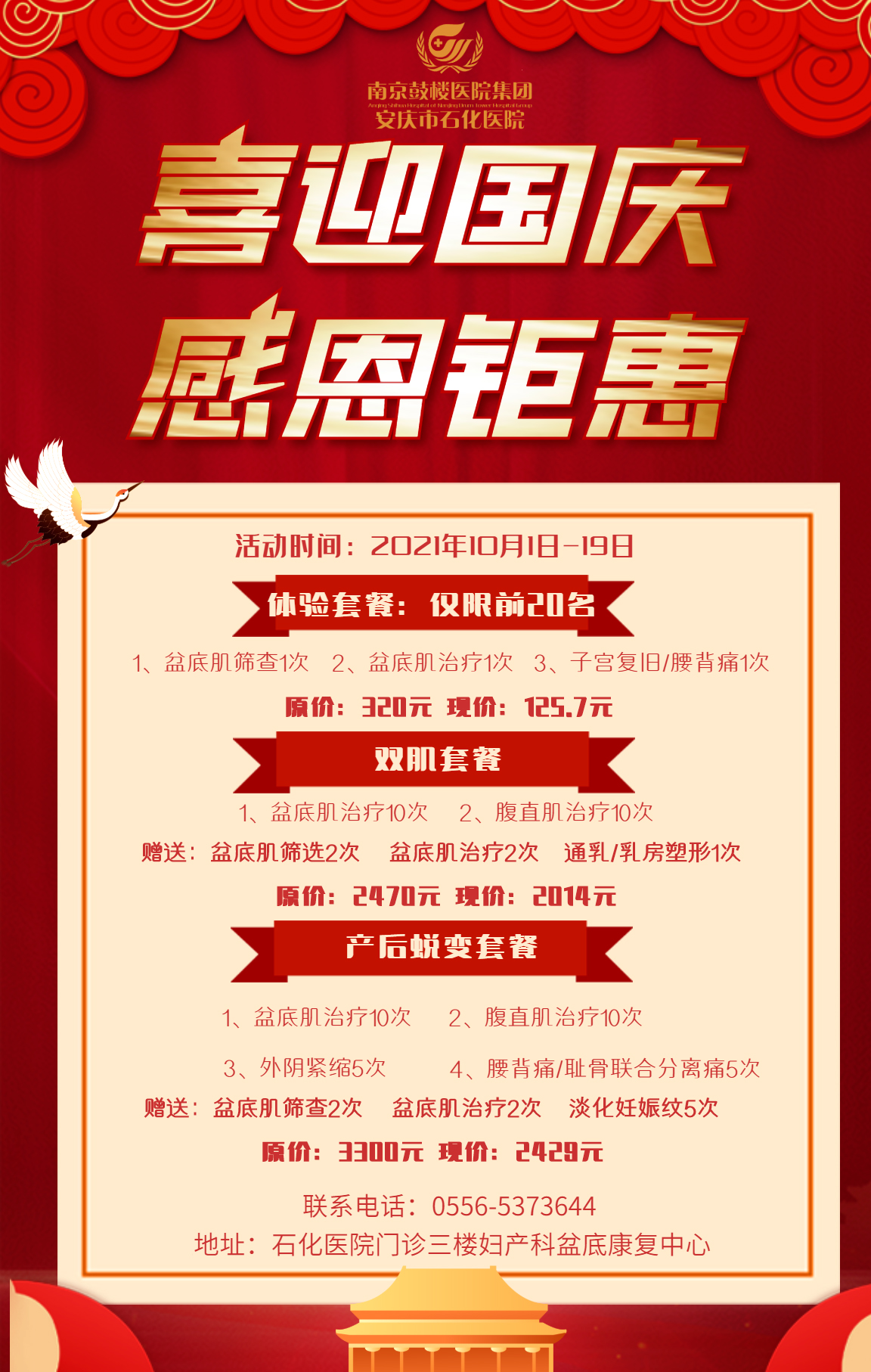 如今,三胎政策已放開,女性朋友們更應(yīng)該在最好的時機(jī)關(guān)注盆底健康。所以,千萬不要錯過這次的國慶特惠活動哦!