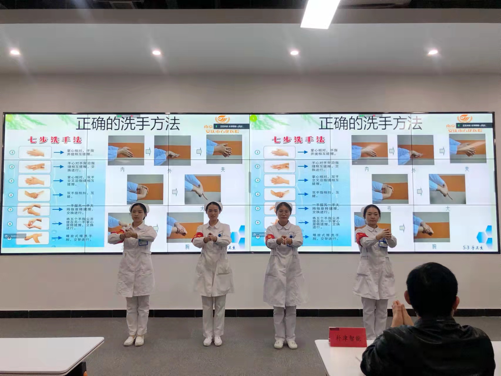 四名護士帶領(lǐng)所有人員集體學習七步洗手法。