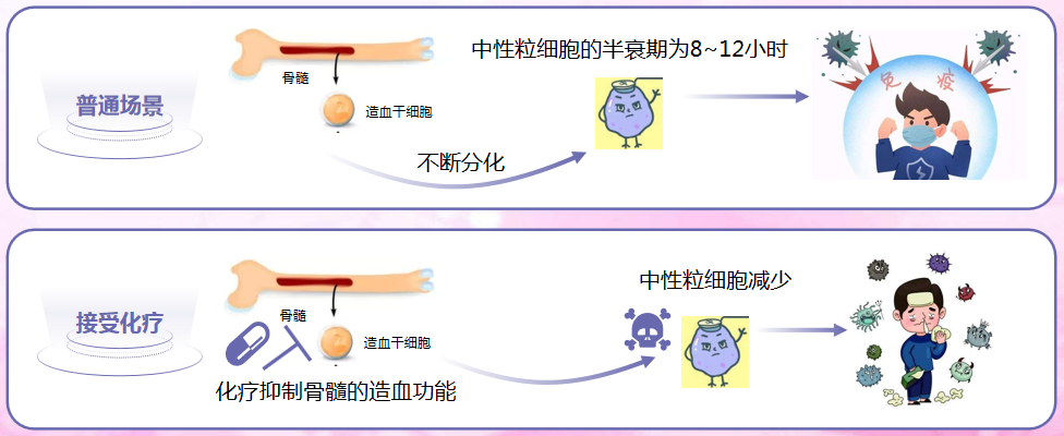 中性粒細胞具有吞噬和殺菌作用,是人體免疫系統(tǒng)的“衛(wèi)兵”。粒缺發(fā)生的原因是中性粒細胞的半衰期僅為8-12小時, 因此骨髓必須不斷產(chǎn)生中性粒細胞。但在化療中,藥物會抑制骨髓的造血功能 ,使成熟的中性粒細胞凋亡后得不到及時更新,造成循環(huán)中的中性粒細胞數(shù)量減少 。