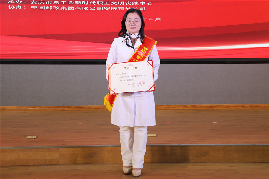 4月21日,在中共安慶市委宣傳部、市總工會(huì)、市文明辦舉辦的安慶市職工職業(yè)道德建設(shè)標(biāo)兵頒獎(jiǎng)典禮上,我院王莘同志同時(shí)獲得安徽省職工職業(yè)道德榮譽(yù)及“安慶市職工職業(yè)道德建設(shè)標(biāo)兵個(gè)人”稱號(hào)。