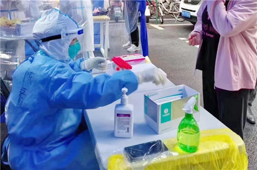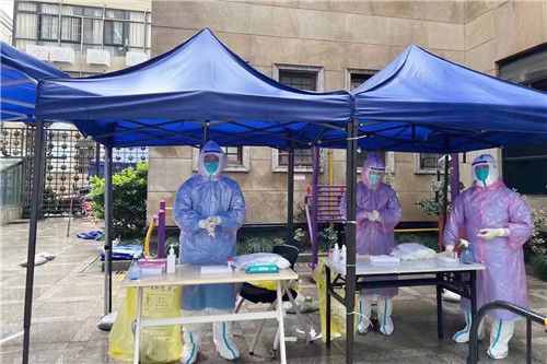 晚上10:00,援滬醫(yī)療隊(duì)從石化醫(yī)院乘坐大巴出發(fā)。路上,領(lǐng)隊(duì)疏平再次為所有隊(duì)員進(jìn)行防護(hù)知識(shí)培訓(xùn),并交代采集任務(wù)相關(guān)注意事項(xiàng)。次日凌晨5:45 抵達(dá)上海市靜安區(qū)。隊(duì)員們僅在車上簡(jiǎn)單進(jìn)食、稍作休息,就立即投入核酸采集工作中。