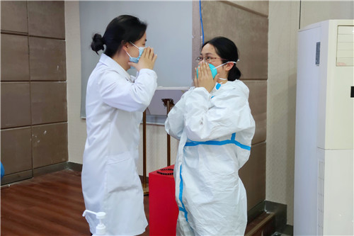 出發(fā)前,院感辦陳麗娟主任及程宏蘭老師為隊(duì)員們?cè)僖淮螐?qiáng)化培訓(xùn),講解注意事項(xiàng),進(jìn)行一對(duì)一指導(dǎo),反復(fù)練習(xí)穿脫防護(hù)服及核酸采樣技術(shù)操作,確保人人過關(guān)。