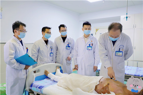 在患者病情穩(wěn)定后,李主任又帶領(lǐng)團(tuán)隊(duì)先后2次為其行受壓處及關(guān)節(jié)活動(dòng)處創(chuàng)面植皮。經(jīng)過燒傷整形一病區(qū)團(tuán)隊(duì)的不懈努力和精心護(hù)理,成功將患者從死亡邊緣救回。