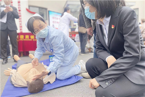 講座現(xiàn)場,大外科護士長、黨員胡蝶結(jié)合生活及臨床工作中遇到的典型案例,用通俗易懂的語言和規(guī)范的動作,為大家講解示范心肺復(fù)蘇的要點。