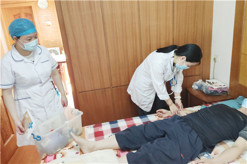 副主任醫(yī)師喻慧和主管護(hù)師何培梅利用下班后的休息時(shí)間,來到李先生家中,為其仔細(xì)護(hù)理置管處,耐心詢問了解口服化療藥物的效果和反應(yīng),并積極提醒家屬注意事項(xiàng)。