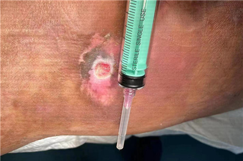 經(jīng)科室醫(yī)護耐心換藥,患者陰囊處竇道逐漸恢復,但長期癱瘓在床,致使骶尾部的壓瘡愈合變得格外困難。針對患者病情,科室團隊充分討論,最終,葉主任決定施行富血小板血漿治療術+骶尾部1%擴創(chuàng)。