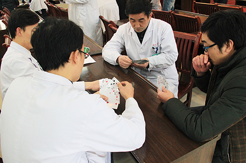 撲克牌摜蛋比賽按照安徽電視臺綜藝頻道“大牌駕到”競賽規(guī)則,采取單淘汰方式進行。4個分會選送的選手抽簽捉對比拼,經(jīng)過前3輪PK,兩對選手進入決賽。男選手韓張杰、陳戒愆牌技精湛、配合精妙;女選手彭鳳艷、童玲一個猛打猛沖、一個沉著穩(wěn)定;決賽的6局比賽進行到第5局時雙方仍未分高下,男選手領(lǐng)先1分。關(guān)鍵的第6局,若男選手得分則獲得冠軍;而女選手需得2分以上才能奪冠,若得1分則金牌制勝。最后牌技和運氣俱佳的臨二分會女選手彭鳳艷、童玲組合如愿獲得2分,拿到冠軍;門診分會韓張杰、陳戒愆獲得亞軍;臨二分會周傳毅、劉和俊和臨一分會王義斌、戴增輝獲第三名。