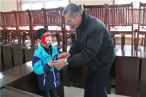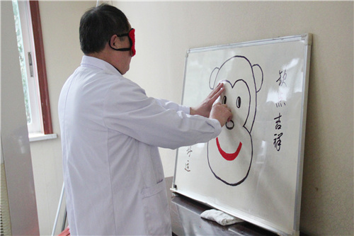 畫鼻游戲現(xiàn)場十分熱鬧,大家排起長龍,躍躍欲試。蒙住眼睛,緩慢邁步向前,伸出雙手,小心翼翼四處摸索,用手量了又量,憑著第六感為猴臉貼上小鼻子。