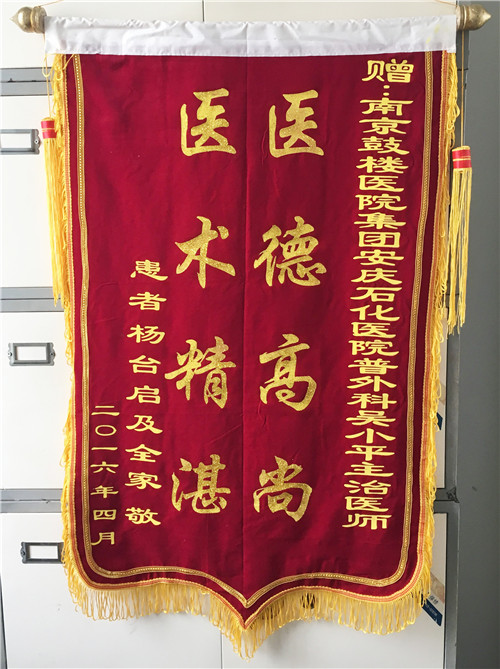 4月11日上午,73歲的楊大爺趕在出院前,為南京鼓樓醫(yī)院集團(tuán)安慶市石化醫(yī)院副院長、主任醫(yī)師、碩士生導(dǎo)師、南京鼓樓醫(yī)院普通外科專家尹衛(wèi)民以及石化醫(yī)院普通外科醫(yī)生吳小平送去錦旗,贊揚(yáng)他們醫(yī)術(shù)高、醫(yī)德好的同時(shí),對石化醫(yī)院的醫(yī)療服務(wù)更是連連稱贊?!拔覐膱?bào)紙上了解到,尹院長是南京疝氣治療方面的專家,這次手術(shù)做得特別好,真是太謝謝他們了?!?/span>