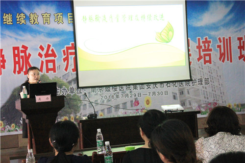 安徽省護理學會副理事長、安徽醫(yī)科大學第二附屬醫(yī)院護理部主任、主任護師吳丹受邀講授了“靜脈輸液質量管理及持續(xù)改進”,南京鼓樓醫(yī)院護理部主任、副主任護師陳雁則和大家分享了“靜脈治療??谱o理學組促進醫(yī)院輸液安全管理”,兩位專家就當前我國輸液中存在的問題和面臨的挑戰(zhàn),強調了如何從護理敏感指標和護士??脐犖榻ㄔO來提高輸液質量和安全。我院藥劑科主任何躍進、護理部主任李桃云、神經外科護士長王勤支、普通外科護士長王萍、消化內科護士長占春風等專家分別就“藥物配伍禁忌”、“中藥制劑輸液安全”、“PICC維護和尖端異位的護理”、“胃腸外營養(yǎng)護理”等作了精彩授課。