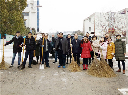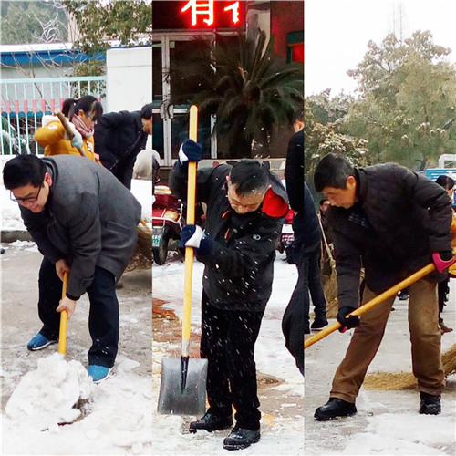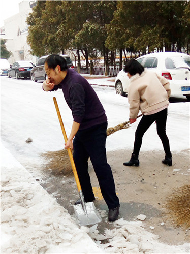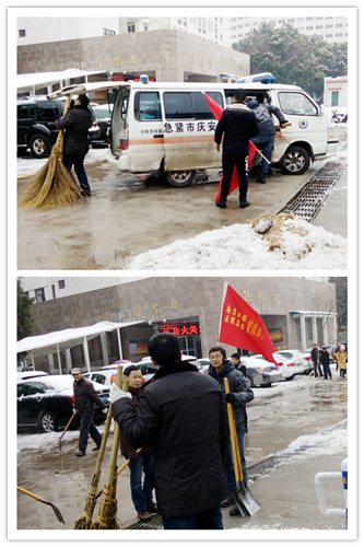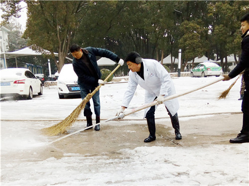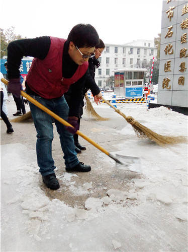 又是一夜的大雪,嚴(yán)嚴(yán)密密地將大地鋪裹上厚重的銀裝。因天寒地凍,雪塊硬如石頭,路面光滑如鏡,無人行,無車動(dòng)。1月28日早晨6:30分,為給患者、員工、市民開辟“安全無障的道路”,由干部、黨員、積極分子組成的石化醫(yī)院突擊隊(duì)又一次投入除冰掃雪的戰(zhàn)斗,鐵釬叮嚀、鐵鍬飛舞,院內(nèi)、廠區(qū)、市區(qū)德寬路留下了他們戰(zhàn)天斗地的歡快身影……