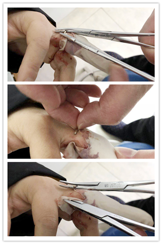 一般遇到此類情況,會先讓患者聯(lián)系消防部門取下戒指后再進行傷口處理。但此時,窗外飄起了大雪,患者疼痛難忍,為不耽誤治療,急診科王志遠(yuǎn)醫(yī)生急中生智,利用血管鉗和持針器夾住戒指,以巧勁將戒指拎斷,再用手慢慢擴大戒指圈,最后用血管鉗和持針器將戒指取下。隨后立即為患者進行清創(chuàng)縫合,快速處理好傷口,贏得了寶貴的治療時間。