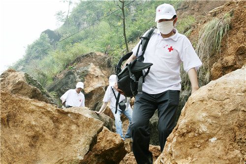 翻看當年醫(yī)療隊留下的資料,其中一張照片非常感人。坍塌山體的碎石間,一個醫(yī)生背著大大的醫(yī)療包,盡力彎著身子,左手牢牢抓著一位老鄉(xiāng)手臂,兩人一個低著頭,一個背著身,都看不見臉上的表情,但是伸手間傳遞的濃濃魚水之情一下子就觸動了觀者,從身形,判斷出這是普外科主任吳爾水。
